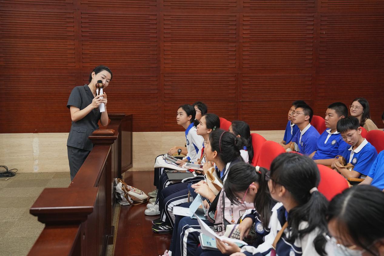 庭审结束后,案件主审法官张艳与同学们展开互动,“看完这场庭审,大家有问题吗?”话音刚落,同学们纷纷举起手来。张艳法官详细介绍了审判席、公诉席和辩护席的功能,阐释了法庭布局所体现的公平与中立原则。她还拿起法槌仔细介绍,“敲击法槌不只是开庭、闭庭的信号,还代表着法律的权威和法官的责任。”